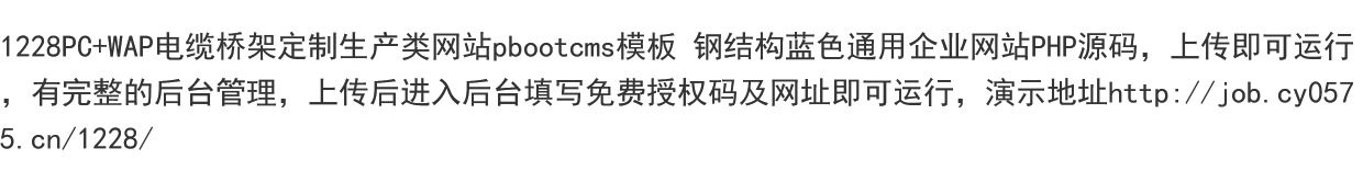 1228PC+WAP电缆桥架定制生产类网站pbootcms模板 钢结构蓝色通用企业网站PHP源码,上传即可运行,有完整的后台管理,上传后进入后台填写免费授权码及网址即可运行,演示地址http://job.cy0575.cn/1228/